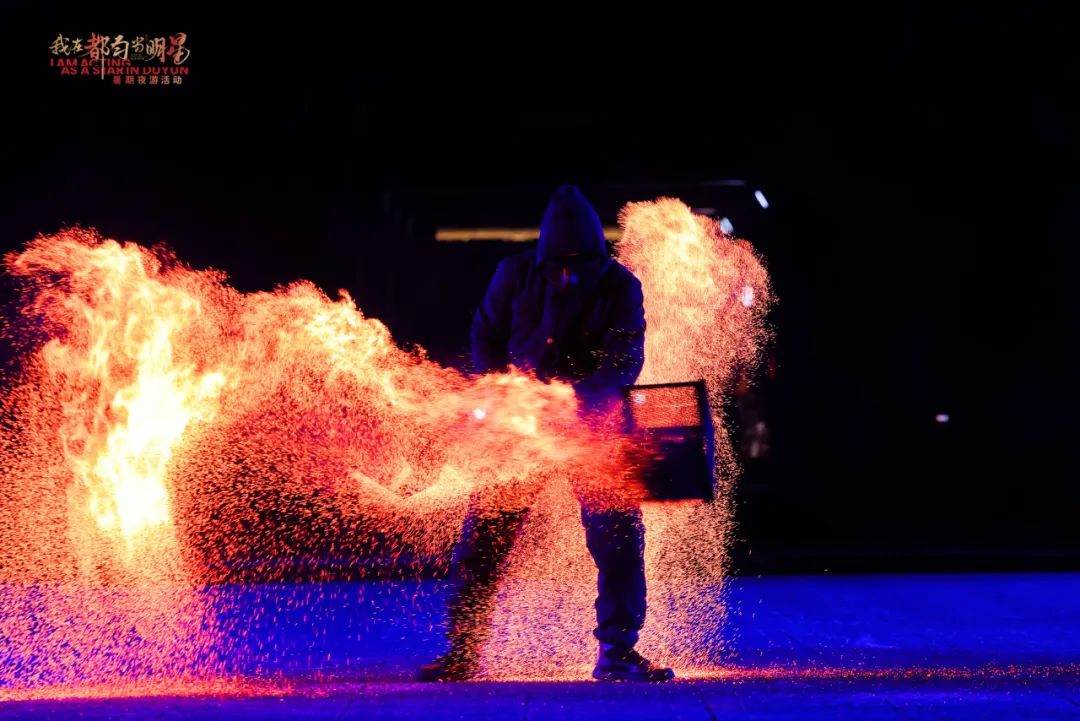 在大殿前,还能观看《十面埋伏—项羽与虞姬》史诗剧目表演,“火人”表演穿插其中,让人目不暇接。