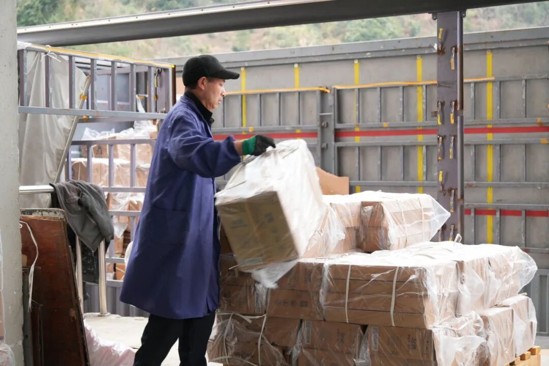 在匀酒成品库多条装车通道前,来自全国各地的物流运输车辆有序排列,宛如一条蓄势待发的长龙。物资部的工作人员不停地穿梭其间,驾驶叉车精准地将一箱箱匀酒产品平稳装入货车。